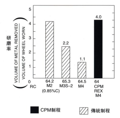 根據(jù)現(xiàn)場的經(jīng)驗(yàn)發(fā)現(xiàn),CPM REX M4高速鋼的研磨性為傳統(tǒng)同類型鋼材的2-3倍℃PM產(chǎn)品可以有效地改善其研磨性,是與其細(xì)致且均勻分布的碳化物有關(guān)。