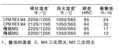 因?yàn)?/span>CPM REX M4具有較細(xì)且均勻分布的碳化物,所以與傳統(tǒng)同類型鋼材比較,具有較細(xì)的品粒及較佳的韌性。事實(shí)上,CPM REEX M4較傳統(tǒng)的M2工具鋼有更佳的韌性,即使在硬度Rc64-65時(shí),耐磨性及韌性都較傳統(tǒng)的M2或M3工具鋼為佳。下表所列是CPM REX M4與傳統(tǒng)M2工具鋼的夏氏沖擊強(qiáng)度(C-Notch Impact Strength)。值得注意的是,較低的硬化效果會(huì)明顯地改善CPM REX M4的沖擊韌性。