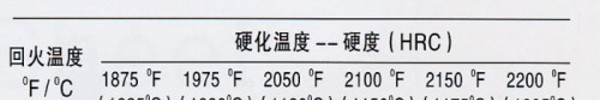 習(xí)慣上CPM REX M4的硬化處理,需使用二部熱處理爐。第一部爐具是用來預(yù)熱至1500-1550℉(815-845℃);第二部爐具是使其從預(yù)熱溫度迅速升溫至2150-2250℉(1175-1230℃)的硬化溫度。