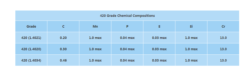 420不銹鋼是一種非常常見的不銹鋼牌號,該牌號是世界上最受歡迎的馬氏體牌號之一。有許多不同的 420 等級版本,但最受歡迎的 3 個版本是 420A、420B 和 420D。420A級根據(jù)EN規(guī)范寫為1.4021或X20Cr13,根據(jù)UNS規(guī)范寫為UNS S42000。此版本包含 ~%0.20 碳,此版本在熱威脅后可以得到高達(dá) 48-50 HRC 的硬度。