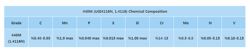 1.4116N根據(jù) EN 標(biāo)準(zhǔn),該牌號寫為 1.4116 或 UGI4116N 或 X50CrMoV15。該等級對于熱威脅來說是一個非常好的等級,對于許多應(yīng)用,該等級優(yōu)于 440B (1.4112) 和 440C (1.4125)。440M 的碳含量比 440B 和 440C 少,因此 440M 材料的含碳量較低。低碳含量也使UGI4116N等級在耐腐蝕性方面更好,因為較高的碳會降低耐腐蝕性。440M 不銹鋼等級可以進行熱威脅和硬化,達(dá)到 57-60 HRC 硬度。對于需要高硬度的應(yīng)用,440M (UGI4116N) 是一個完美的選擇,在許多應(yīng)用中,440M 等級可以作為 440B (1.4112) 和 440C (1.4125) 的替代品。440M材料通常用于鉆頭、手工具、