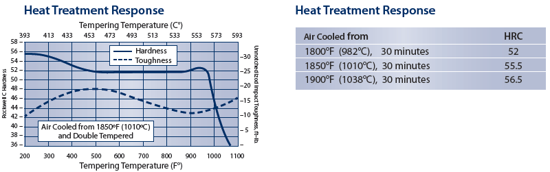 回火:淬火后立即回火。700oF(371oC)的典型回火范圍將導(dǎo)致硬度約為51至53 HRC。但是,可以使用400至775℉(204-413℃)范圍內(nèi)的回火溫度。在回火溫度下保持每英寸(25.4mm)厚度1小時(shí),但不少于4小時(shí),然后空氣冷卻至環(huán)境溫度。需要雙重回火。為了最大限度地提高韌性,建議采用第三種方法。